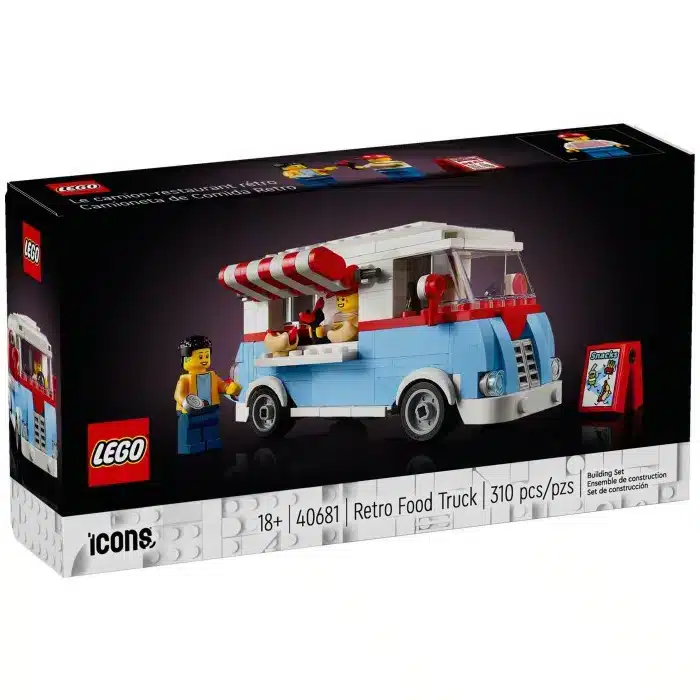 LEGO 40681 Retro Food Truck is a 310 piece Icons set with 2 minifigs and features a detailed mid-century retro food truck with a food prep area, cooktop, soda machine, awning, menu board, and fold-down condiment tray. Includes vendor and customer minifigures, plus food accessories like fries and a hot dog.